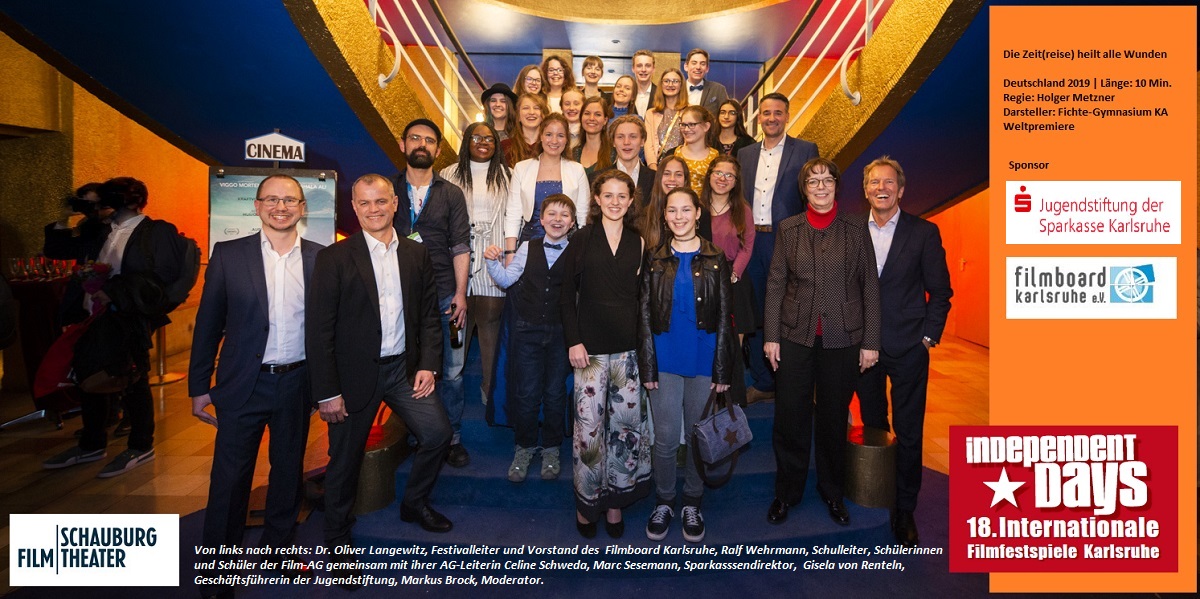 Am Samstagabend, den 6. April 2019, wurde der selbstproduzierte Kurzfilm „Die Zeit(reise) heilt alle Wunden“ der Film-AG des Fichte-Gymnasiums auf der AWARD GALA der Independent Days, den 19. Internationalen Filmfestspielen Karlsruhe, in der Schauburg gezeigt. Ermöglicht wurde dieses großartige Projekt durch den 8. Film- & Vision-Schul-Contest, den die Jugendstiftung der Sparkasse Karlsruhe und das Filmboard Karlsruhe e.V. mit den Schülerinnen und Schülern des Fichte-Gymnasiums durchführten. Regie führte der Dramaturg und Regisseur Holger Metzner. Die Gesamtkosten des Projekts übernahm die Jugendstiftung der Sparkasse Karlsruhe.