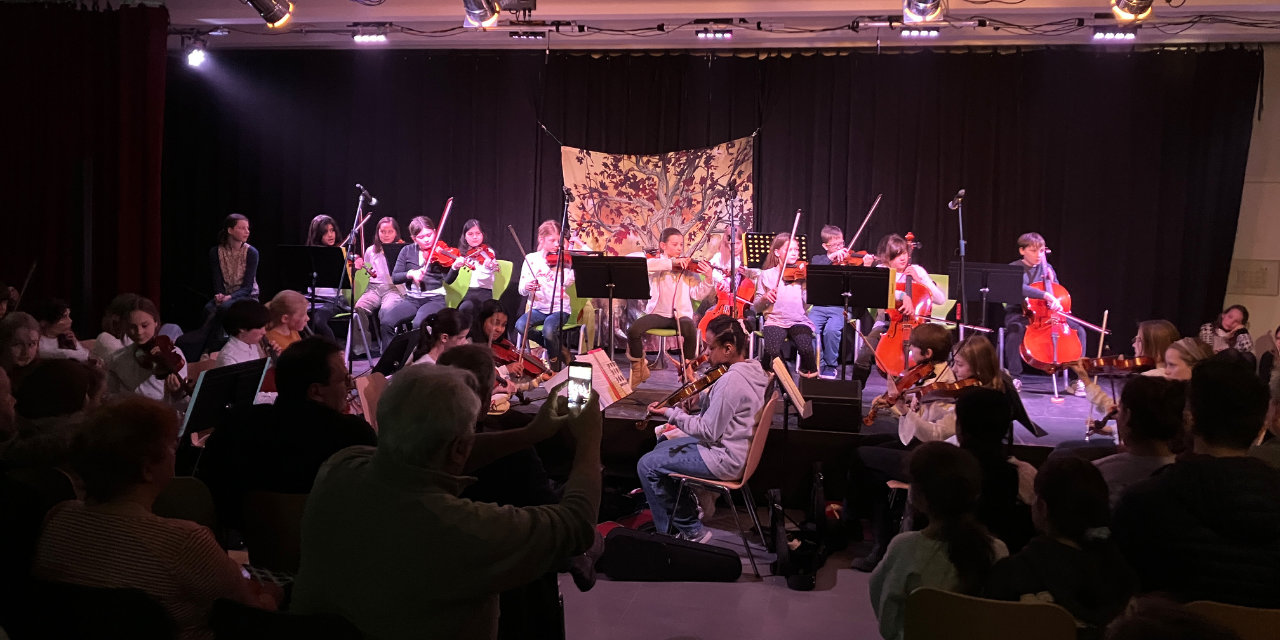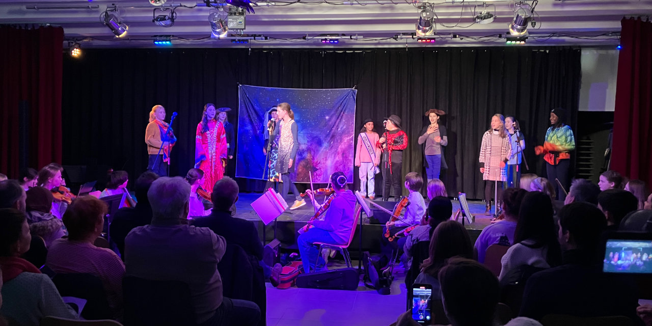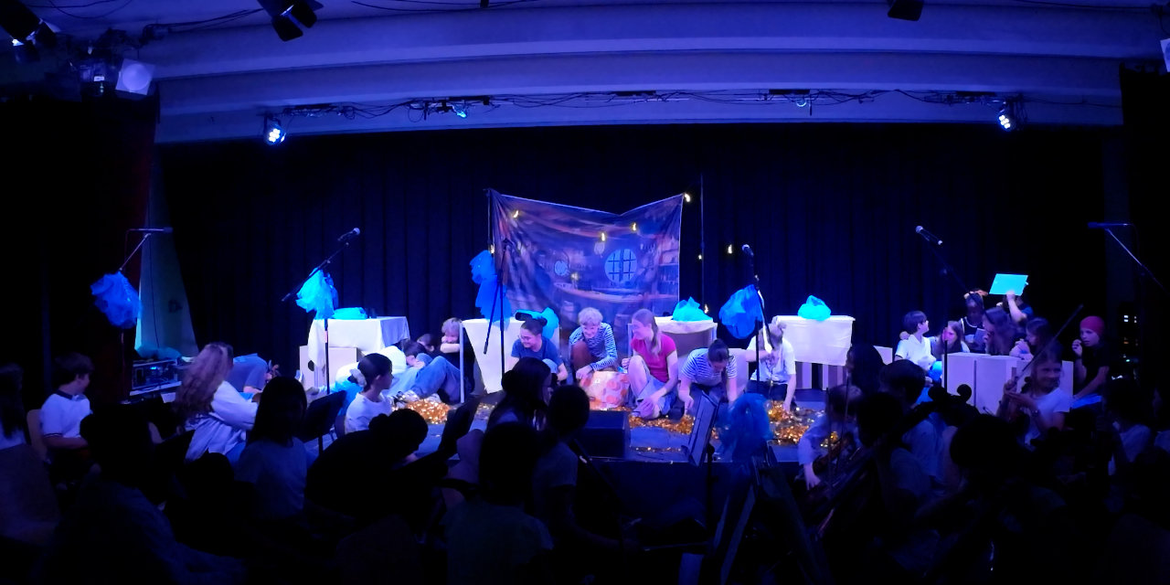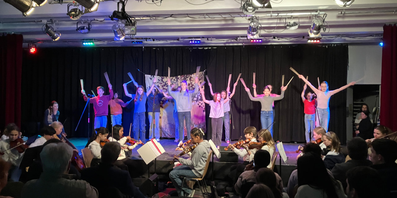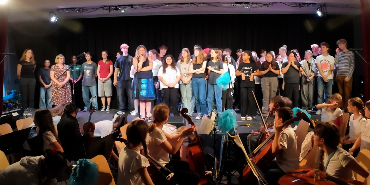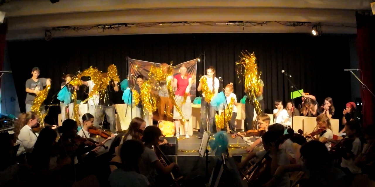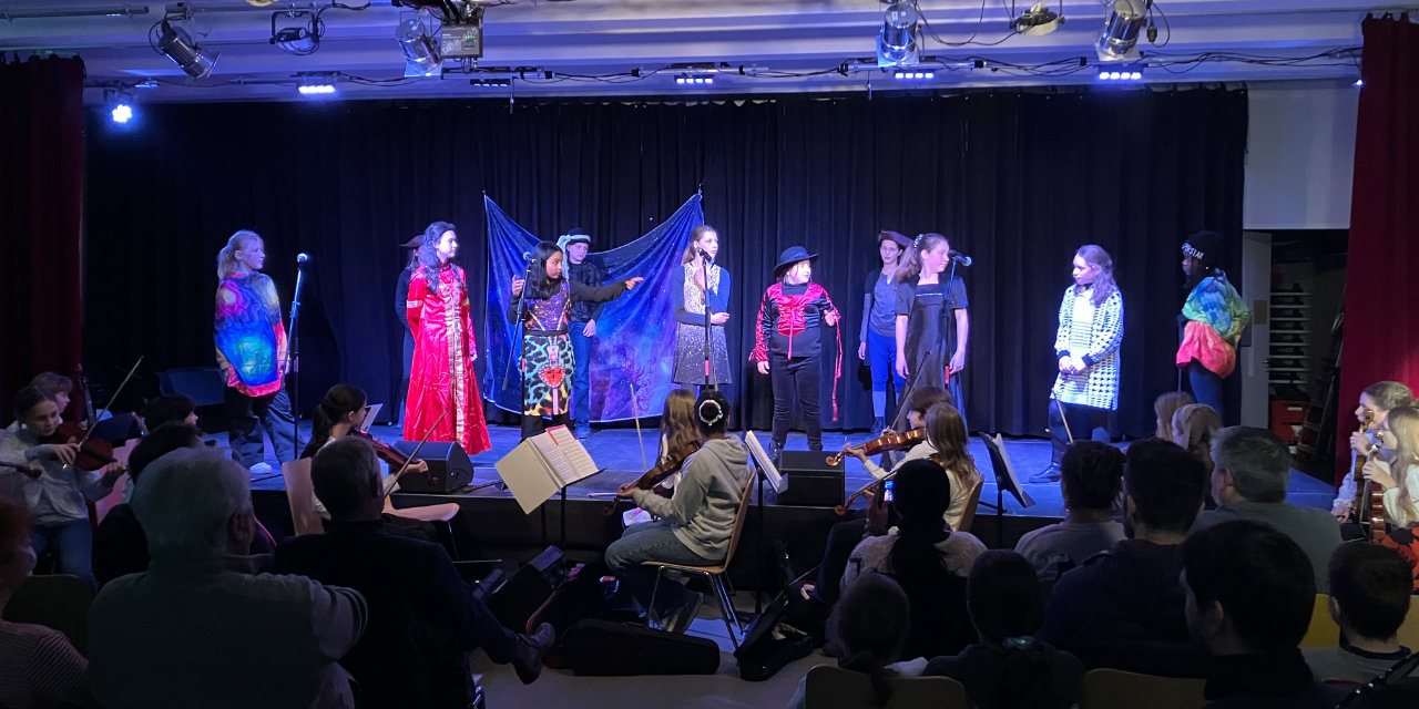 Mit Bühne, Beleuchtung und Sound der Technik-AG von Lucas Schütt, insgesamt 34 StreicherInnen der Klassen 5 und 6 sowie 25 DarstellerInnen der Singer-Songwriter-AG und der K1.1, dem Chor von Frau Steinmetz und dem Projektchor der 9b von Frau Odenwälder waren zwei Aufführungen voller Power und Zauber zu erleben, die vom zahlreichen Publikum begeistert gefeiert wurden.