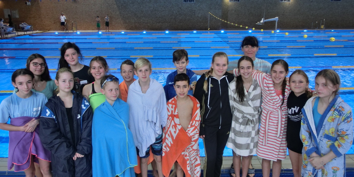 Am Montag, den 13.November 2017, fanden im Fächerbad Karlsruhe die 30.Schüler-Schwimm-Meisterschaften der Jugendstiftung der Sparkasse statt, bei denen die Mannschaft des Fichte-Gymnasiums, bestehend aus 17 Schülerinnen und Schülern der 5.-7. Klassen, teilnahmen. Mit dabei waren Laura Schäfer und Elena Arlt als Sportmentorinnen und natürlich auch Frau Kunz und Herr Büchler, die die Mannschaft vor und während des Wettkampfes organisierten.
