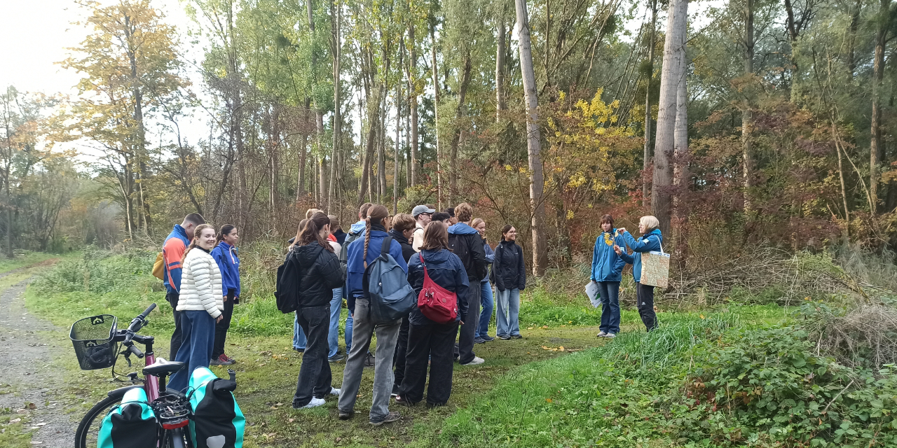 Am 09.10.25, einem wunderschönen, klaren und trockenen Herbsttag, trafen sich die Schüler:innen des Basisfaches Biologie der K2 an der Altrheinbrücke, um einen gemeinsamen Vormittag in den Altrheinauen zu verbringen. Im Unterricht war gerade Ökologie das Thema und der Tag außerhalb der Schule sollte dazu dienen, das Ökosystem Rheinaue genauer kennenzulernen und auch wissenschaftlich zu untersuchen. Um 8.30 Uhr begrüßte uns Frau Pimentel vom Naturschutzzentrum Rappenwörth und führte uns mit einem kleinen Vortrag direkt am Rand des Altrheins an diesen sehr speziellen Lebensraum heran und machte uns auf die besonderen ökologischen Gegebenheiten aufmerksam.