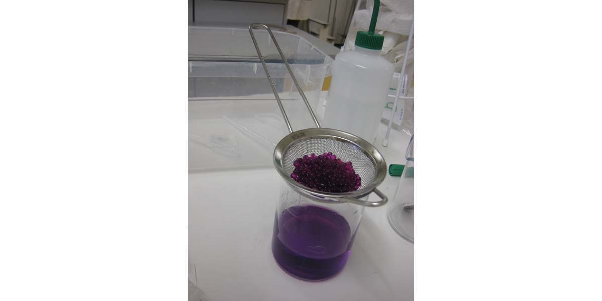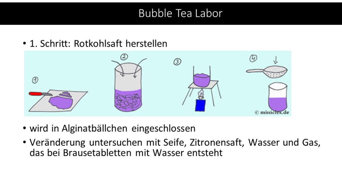 Unter Betreuung künftiger Lehramtsanwärter*innen wurden Reaktionen in Alginatbällchen erforscht. Alginatbällchen sind den Schüler*innen als Bubble-Tea-Bällchen aus dem beliebten Modegetränk bekannt gewesen.