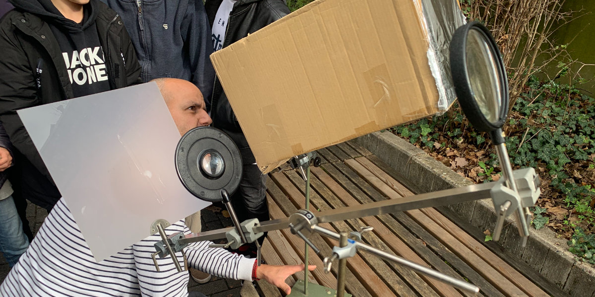 Am 25.10.2022 war in Süddeutschland eine partielle Sonnenfinsternis zu beobachten. Herr Löhlein hat dazu auf dem Pausenhof drei Apparaturen aufgebaut, um den Schülerinnen und Schülern die Beobachtung zu ermöglichen.