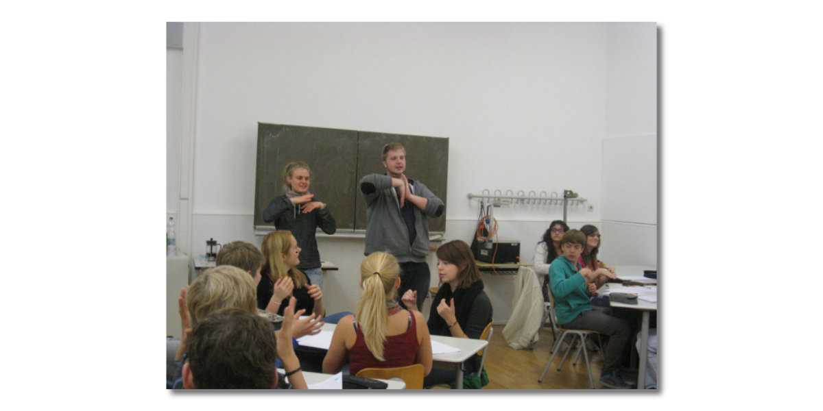 Um uns einen Einblick in ihre Arbeit zu verschaffen, erklärte sie uns mit viel Elan und Überzeugung, auf was es beim Theaterspielen ankommt und was Theater überhaupt ist. Dabei merkte man, wie wichtig ihr Konzentration und Aufmerksamkeit sind. Sobald man nicht mehr mitdachte oder sich anders beschäftigte, unterbrach sie ihre Erläuterungen und wartete so lange, bis ihr wieder alle zuhörten.