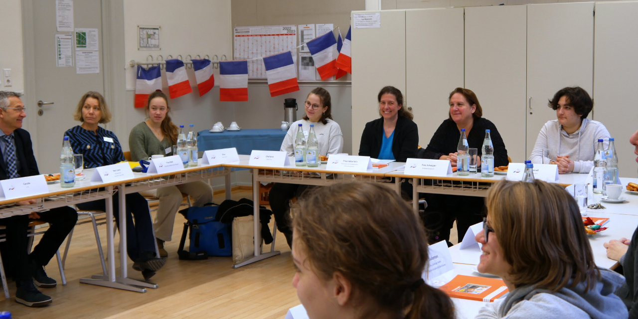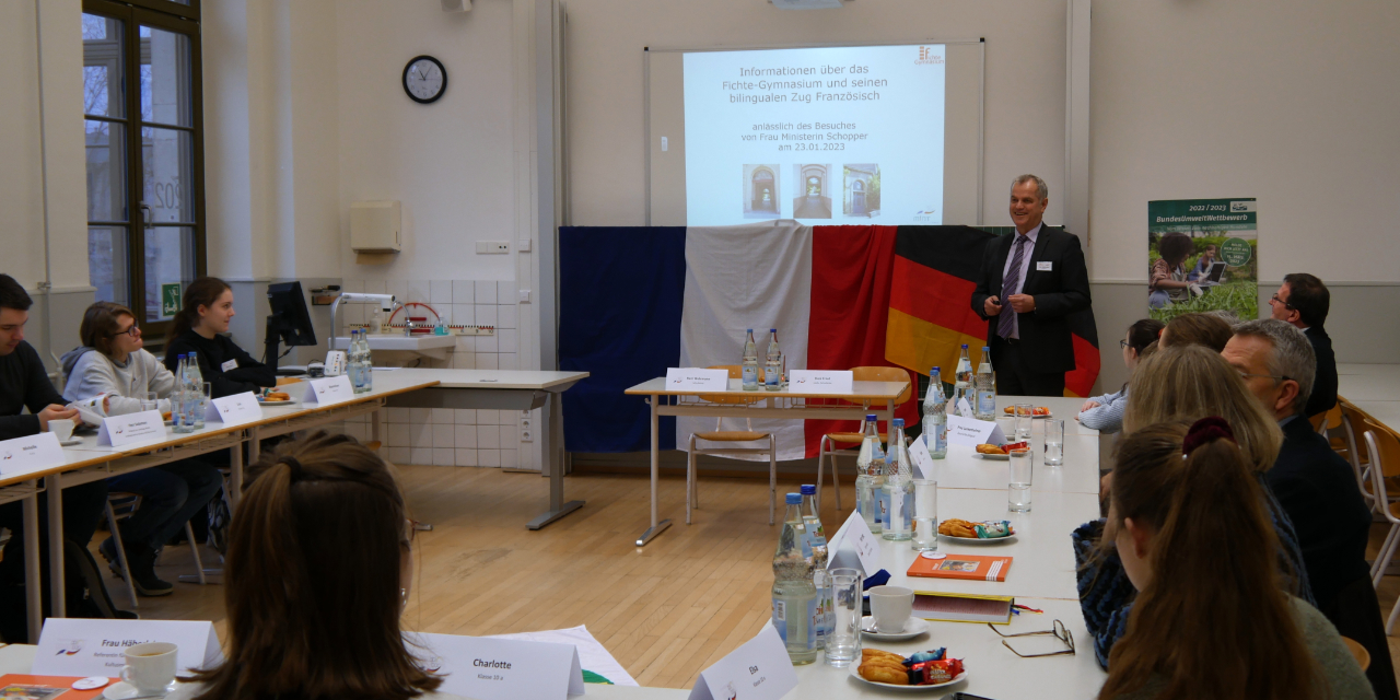 In einer Gesprächsrunde, zu der neben den politischen Amtsspitzen, Herrn Wehrmann und Herrn Ernst auch Schülerinnen und Schüler sowie Französischlehrerinnen des bilingualen Zuges des Fichte-Gymnasiums geladen waren, herrschte von Anfang an eine ganz besondere zeremonielle Stimmung. Herr Wehrmann gab zunächst gemeinsam mit Frau Lanske einen Einblick in das bilinguale Angebot des Fichte-Gymnasiums und stellte unsere Aktionen rund um den Jahrestag des Élysée-Vertrags vor. Das Bild wurde durch Beiträge unserer Schülerinnen und Schüler sowie Lehrerinnen und Lehrer erweitert, die von ihren Erfahrungen berichteten und einzelne Aspekte, wie beispielsweise die Drittortbegegnung oder aber die gelebte deutsch-französische Freundschaft im Rahmen unserer deutsch-französischen Theater-AG vertieften.