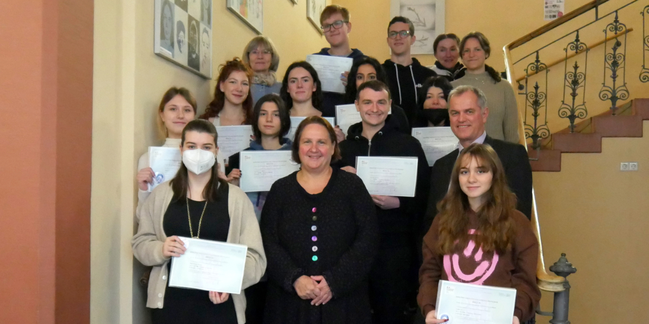 Abschließend überreichte Ministerin Schopper den Fichte-Schülerinnen und -Schülern feierlich die Urkunden für die erfolgreich im regulären Französischunterricht bestandenen DELF-Prüfungen.