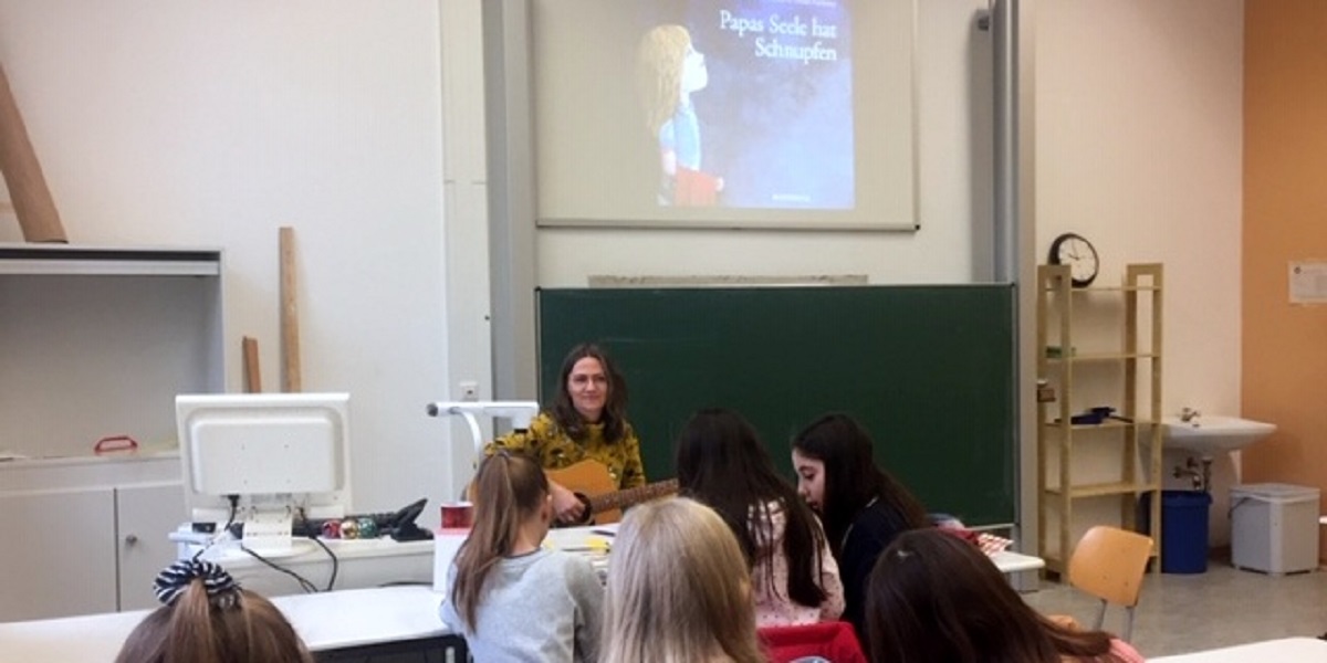 Am 14. Februar 2020 war die Karlsruher Autorin Claudia Gliemann zu Besuch in den 5. Klassen mit einer musikalischen Lesung zu ihrem preisgekrönten Buch „Papas Seele hat Schnupfen“. Die Geschichte beschreibt, wie das Zirkuskind Nele lernt, mit der Depression ihres Vaters umzugehen. „Ich möchte für das Thema sensibilisieren, denn es ist immer noch ein Tabu. Um die Familie und die Kinder von depressiven Patienten kümmert man sich erst, wenn sie selbst psychische Auffälligkeiten zeigen. Das ist zu spät.“ (Claudia Gliemann)