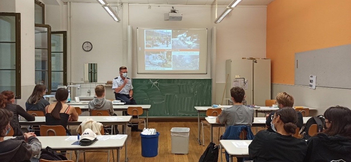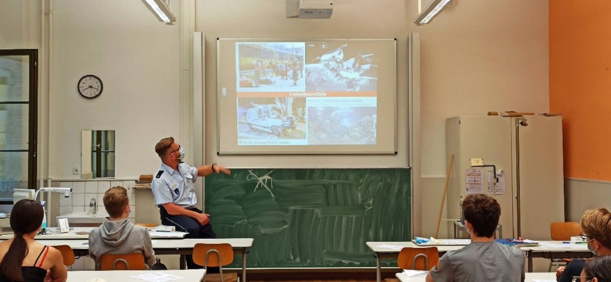 Vom 5. bis zum 8. Juli 2021 hatten alle Neunt- und Zehntklässler des Fichte-Gymnasiums Besuch von Herrn Heybl von der Karlsruher Polizei. Eine Doppelstunde lang lauschten die Schülerinnen und Schüler den vielen spannenden Erfahrungsberichten des Beamten und konnten Fragen zum Thema Drogenkonsum und den strafrechtlichen Folgen stellen und sich austauschen.
