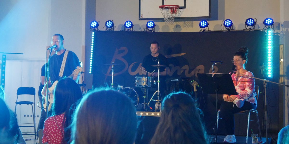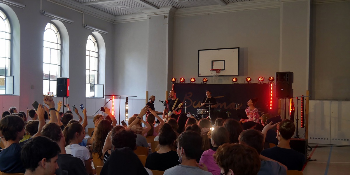 Über hundert Schülerinnen und Schüler, die sich umarmen, allen sagen wie gerne sie einander haben und Freundschaft und Zusammenhalt feiern. Dies ist das Ergebnis der Konzertlesung von Jana Crämer und Batomae, die als Ergänzung zum Programm "bauchgefühl" der BKK am Donnerstag, den 21. Juli 2022, für die 9. Klassen des Fichte-Gymnasiums stattfand.