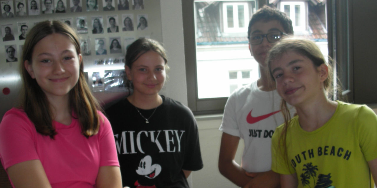 Beim Sektempfang im Lehrerzimmer gedachten die 11 rüstigen Damen gemeinsam mit ihrem damaligen Klassenlehrer der 5. Klasse, Herr Albertini, zunächst der bereits verstorbenen Schulkameradinnen. Ein bewegender Moment auch für die 4 Schülerinnen und Schüler aus der Klasse 7a, die mitgeholfen haben. Folgten viele: „Weißt du noch…?!“, „Wer kann sich daran erinnern, wo….?“ Und „Was, das weißt du nicht mehr?“, jeweils gefolgt von Anekdoten, Geschichten und Erzählungen, die das Fichte von damals zum Leben erweckten und die auch für uns, wie wir nicht dabei waren, höchst amüsant und interessant waren. Zum Beispiel war damals Latein für alle Pflicht, und heute wird das Fach nicht mal mehr als AG angeboten.