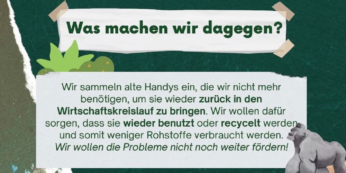 Seid ihr engagiert in Sachen Umwelt, wolltet schon immer mal Leben retten und habt ein altes Handy zuhause herumliegen? Wir, die Klasse 10b, sammeln gemeinsam mit Herrn Beiler Althandys, um diese zu recyclen und uns damit gegen Kinderarbeit, schlechte Arbeitsbedingungen und Kriege in der Demokratischen Republik Kongo einzusetzen. Die eingenommene Summe wird an den Naturschutzbund Deutschland (NABU) gespendet, welche sich außerdem für Bienen, Hummeln und Co. einsetzt.