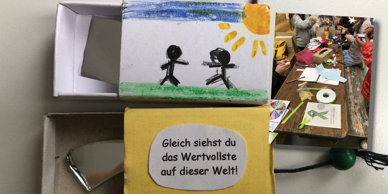 Unsere Schulsozialarbeiterin Frau Kaiser hat dazu im Mensagebäude einen Stand angeboten. Die Schüler*innen konnten Infomaterial mitnehmen, auf einem Plakat vermerken, was ihnen gut tut oder sich die grüne Solidaritätsschleife anheften. Daneben wurden fleißig kleine Schachteln gebastelt mit dem Titel „Gleich siehst du das Wertvollste auf der Welt“ – innen ist: ein Spiegel.