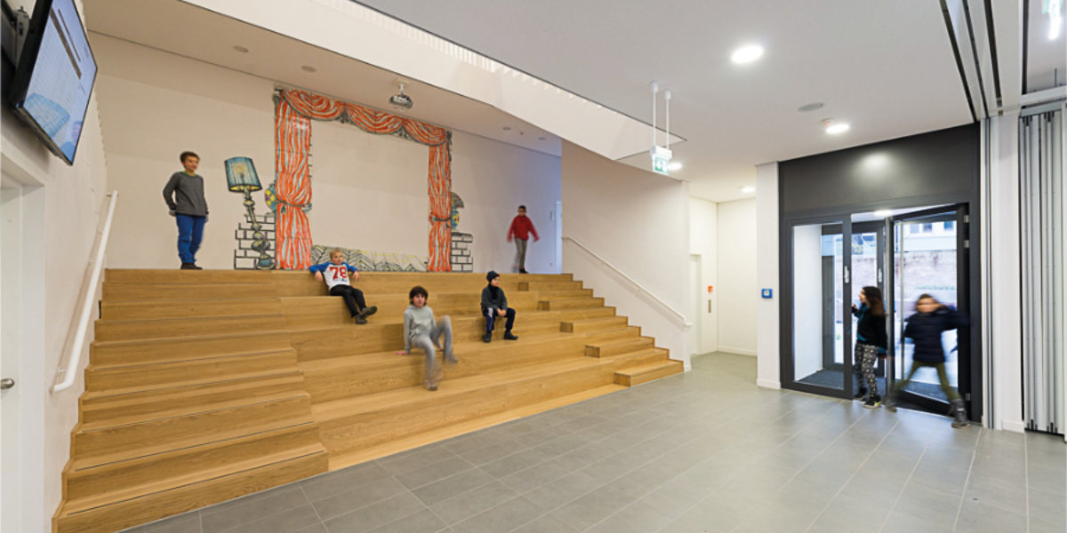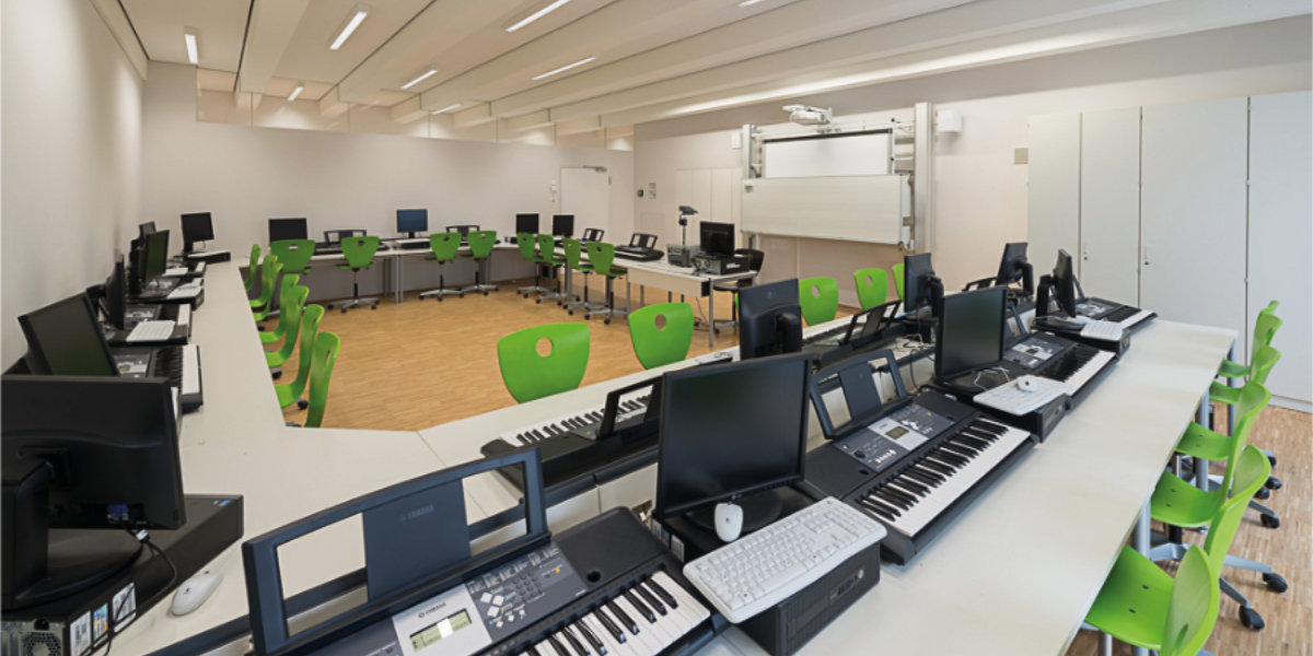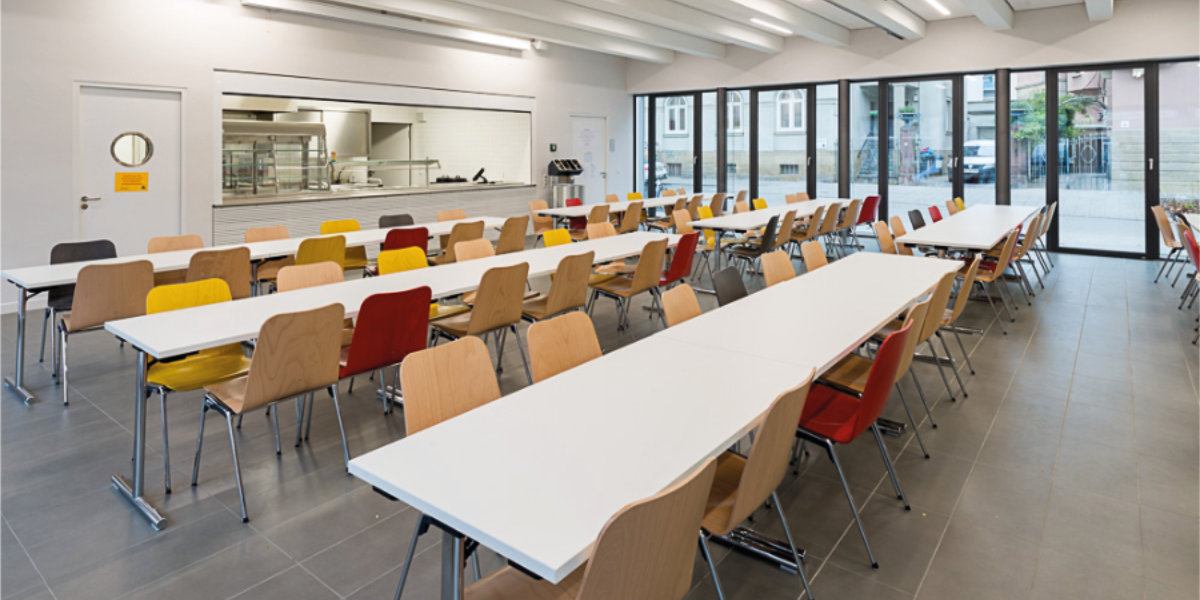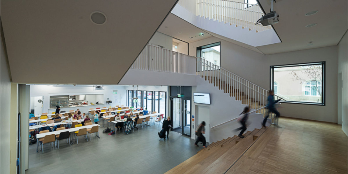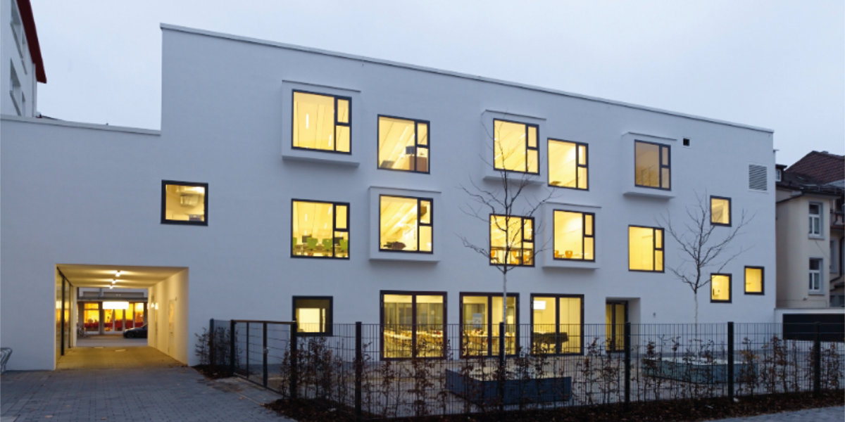 Im Schuljahr 2015 haben wir ein schönes neues Gebäude in der Sophienstraße hinzubekommen. Es beherbergt die Mensa, unsere Musikräume und die Räume für die Nachmittagsbetreuung. Die Mensa fungiert nebenbei als Multifunktionsraum, in dem unsere Gottesdienste am Ende der Schuljahre, unsere Konzerte und Unterstufenparties, aber auch unsere Tanzabende stattfinden.