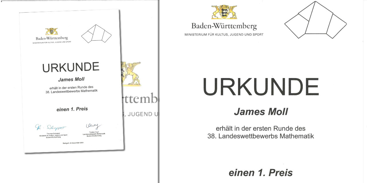 James Moll (10a) wurde mit einem 1. Preis im Landeswettbewerb Mathematik ausgezeichnet!