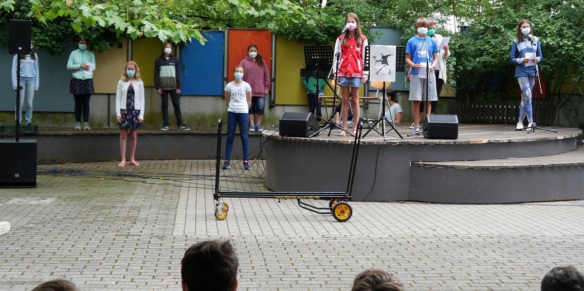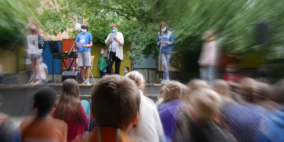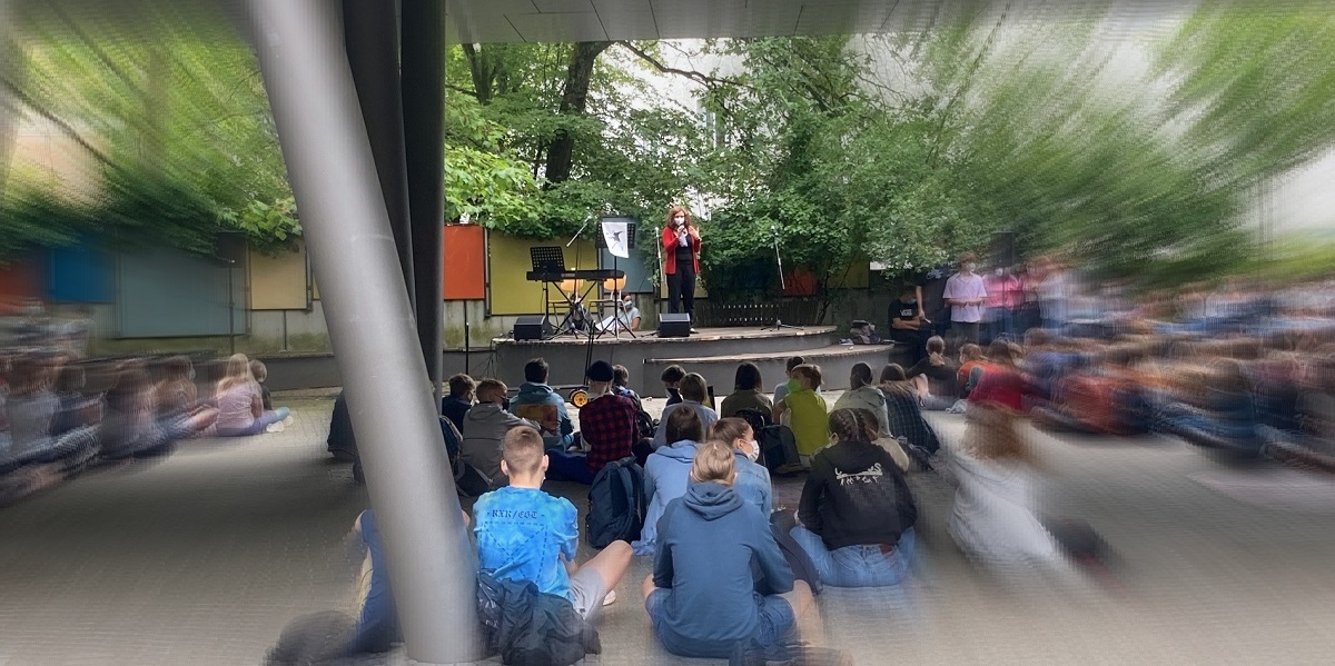 Am heutigen letzten Schultag vor den Sommerferien versammelten sich einige unserer Schülerinnen und Schüler gemeinsam mit ihren Lehrerinnen und Lehrern vor Schulbeginn coronakonform – nach Schulklassen getrennt – auf dem Schulhof, um an einem Gottesdienst zum Thema „Überwinde das Böse mit dem Guten“ teilzunehmen. Dieser wurde von unserer Religionslehrerin, Frau Kerstin Müller, gemeinsam mit den evangelischen Religionsgruppen Klasse 10a/d inhaltlich gestaltet und musikalisch am Piano und durch unsere Fichte-Songwriter untermalt.