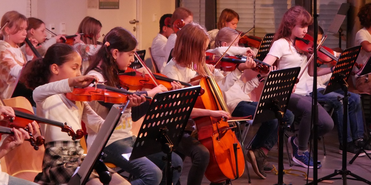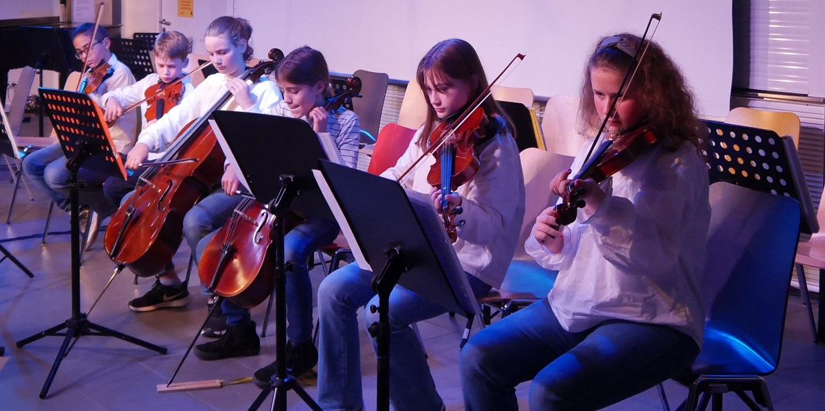 Der Abend startete mit "Music" von John Miles der 6. und 7. Streicherklassen, begleitet von Frau Klose am Keyboard. Nach ein paar erklärenden Worten zum Motto des Abends ging es weiter mit "Swallowtail Jig" und "Dance Dance Dance". Darauf folgte ein Überraschungssolo der ehemaligen Lehrerin des Fichte-Gymnasium, Roswitha Riehle. Sie zauberte "Claire de Lune" von Claude Debussy auf den hauseigenen Flügel – im Raum wurde es mucksmäuschenstill. Zum Staunen kam das Publikum außerdem durch die Streicher der 5. Klasse: Mit nur wenigen Wochen Übung an dem für sie noch ganz neuen Instrument und mit viel Mut präsentierten sie dem Publikum "Bruder Jakob" – beeindruckend! Nach "Musette" von Johann Sebastian Bach, das sogar dreistimmig gespielt wurde, konnte sich das Publikum in der Pause bei einem reichhaltigen Buffet stärken. Genauso abwechslungsreich ging es in die zweite Hälfte: Mit "Somewhere Over the Rainbow", "Eye of the Tiger", "You´re the voice", "Rock me Amadeus" und "Open String Samba" zeigten uns die Geiger, Bratschen und Cellisten ihr Können und ihre Freude am Spielen. Gegen Ende war es dann Zeit für die "Special Guests" des Abends: Schülerinnen und Schüler der K1 mit Wilfried Franz am Synth-Bass überraschten die Zuschauer mit "In the Army now" von Status Quo. Wie so oft stand auch hier der Ukraine-Krieg mit den verheerenden Folgen im Raum. Als krönender Abschluss und ganz im Spirit eines "Proms"-Konzertes wurde schließlich noch "Land of Hope and Glory" von Edward Elgar zum Besten gegeben.