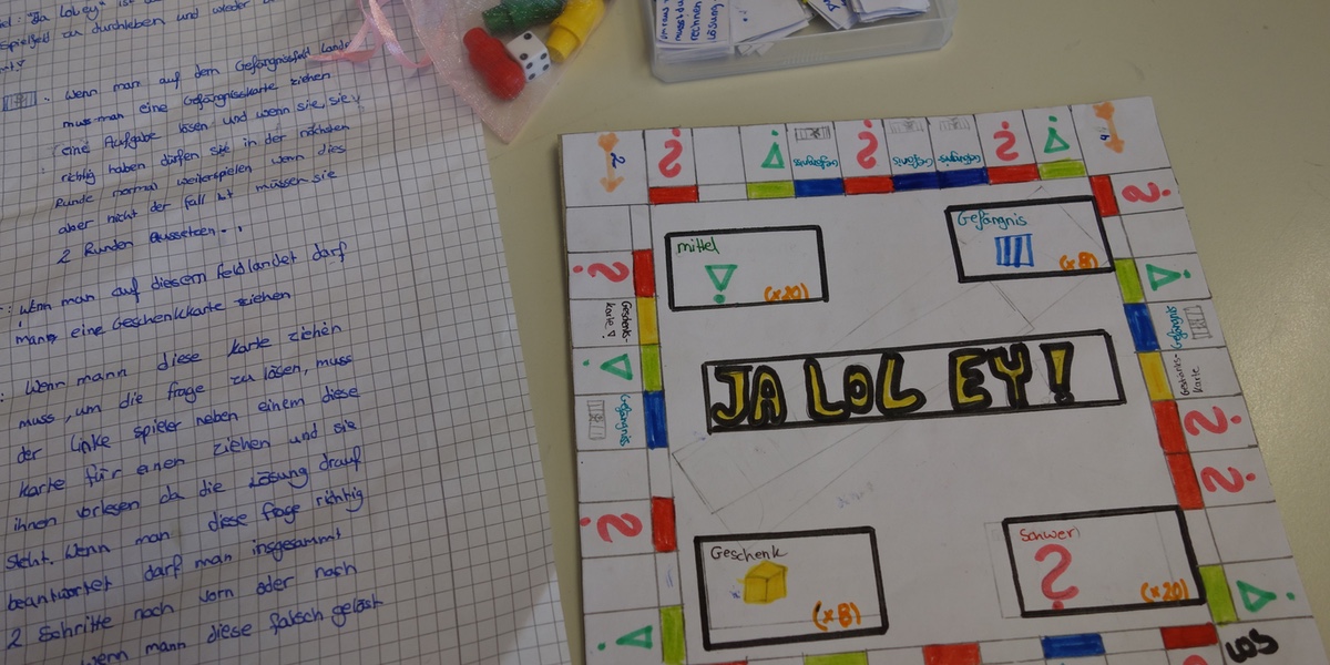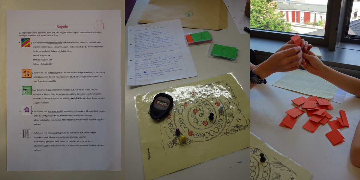 Unsere Mathematiklehrerin Frau Cedzich gab uns den Auftrag in Dreier- bzw. Vierergruppen ein eigenes Spiel zu entwickeln, mit dem der Stoff aus dem bisherigen Mathematikunterricht der Klasse 5 und 6 geübt und wiederholt werden kann. Ein Spielplan diente als Vorlage, welcher individuell gestaltet werden konnte. Jedoch war es auch möglich einen eigenen Plan zu entwickeln.