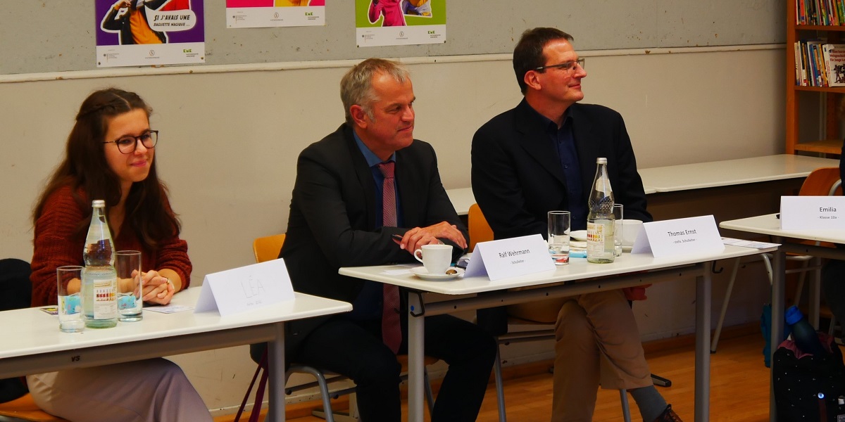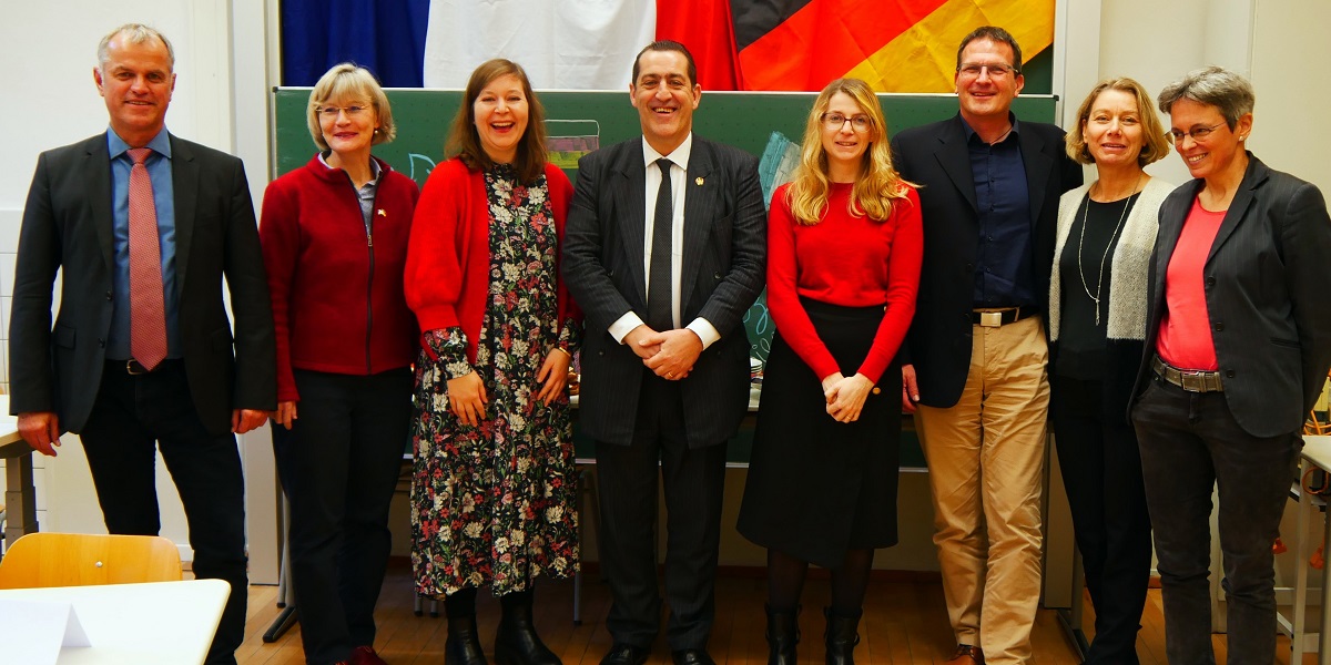 In einer ersten Runde standen die Schulleitung, Herr Wehrmann und Herr Ernst, für ein Gespräch zur Verfügung, gemeinsam mit Vertreterinnen der bilingual unterrichteten Sachfächer: für Geschichte Frau Lunkenheimer, für Gemeinschaftskunde Frau Raab sowie für Geographie in Personalunion mit dem Vorsitz der Französischfachschaft Frau Lanske. Außerdem war mit dabei Frau Göbeler von unserem Kooperationspartner Centre culturel, wo der Generalkonsul im Anschluss einen Termin hatte. Unsere Französischreferendarin Frau Hopf vertrat die künftigen Französischlehrkräfte und übernahm darüber hinaus die Pressearbeit, indem sie das Treffen mit der Kamera in der Hand dokumentierte.