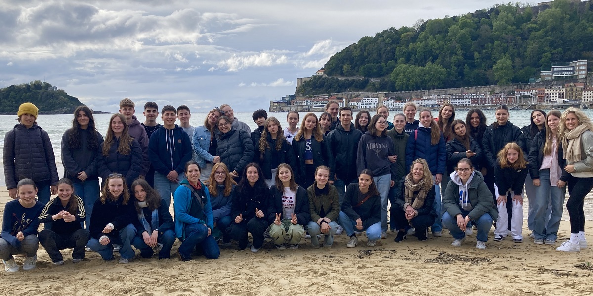 Vom 21. bis 26. April 2024 fuhren 40 Schülerinnen und Schüler der Spanischklassen 9 und 10 zusammen mit Frau Förster, Frau Iglesias und Frau Bierlein für sechs Tage in die spanische Stadt San Sebastián (Donostia - San Sebastián) nahe der französischen Grenze. Am Sonntagmorgen um 8 Uhr ging es mit dem Zug vom Karlsruher Hauptbahnhof nach Spanien. Nach einem kurzen Zwischenstopp in Paris kamen wir nach insgesamt neun Stunden Fahrt leicht erschöpft, aber umso glücklicher in San Sebastián an.