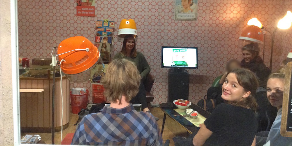Das Bild zeigt einige SchülerInnen während des Symposiums zu den Hörspielen im sogenannten „Studio Helga“ im ZKM, unter den Trockenhauben kann man sich die Hörspiele anhören.